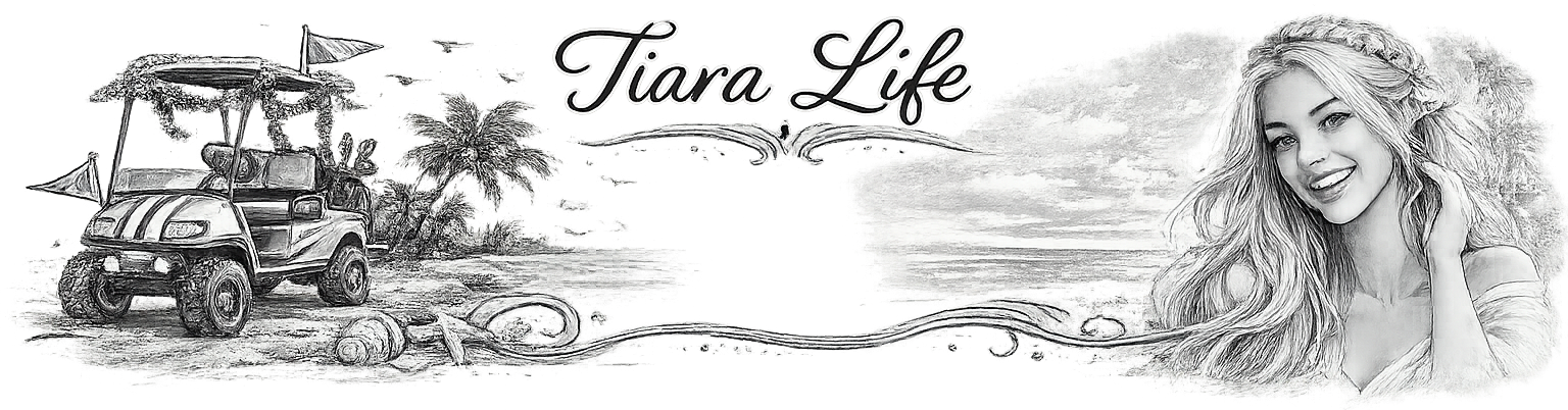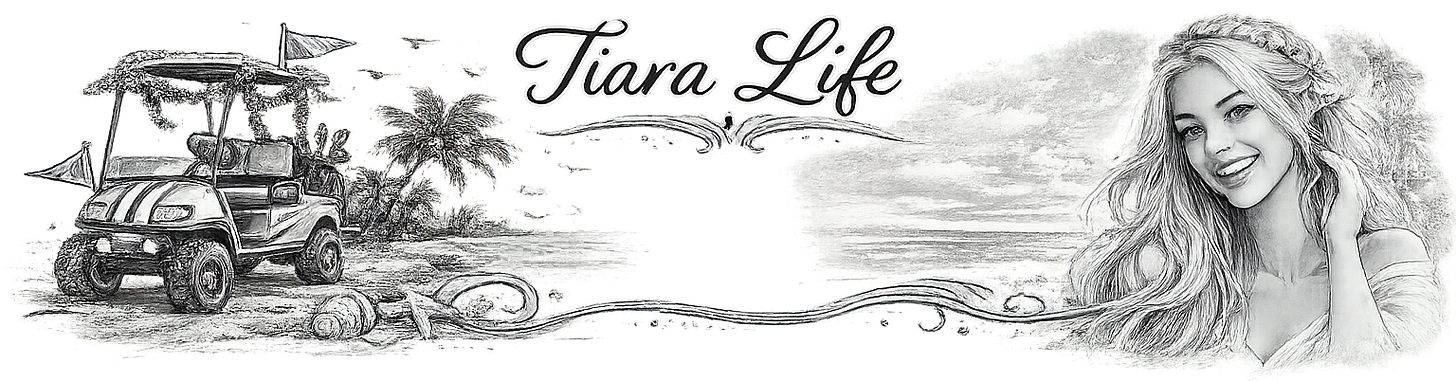 We set off on the two mile run to the airport like a convoy destined for greatness. Tonya was driving, next to me, with Tom and Sharon in the VIP seats. We all were branded and wearing Tiaras. The carts had been decorated for the trip with stick-on black racing stripes down low and pink tinsel boa’s, along the top of the cage.