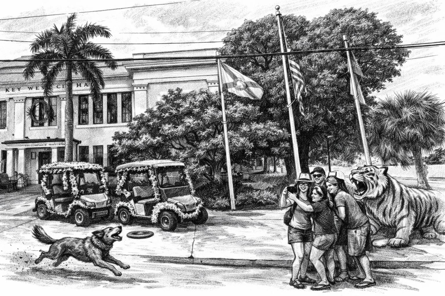 City Hall in Key West is a converted high school from the ‘40s. It’s been remodeled and extended several times, but it still has “the look” of a school from back in the day, complete with crisp white paint and a bigger-than-life tiger sculpture anchoring the corner of White and United streets.